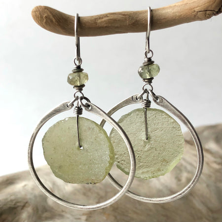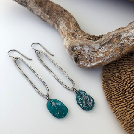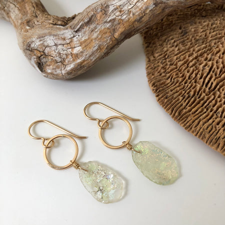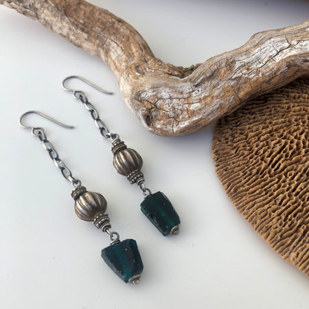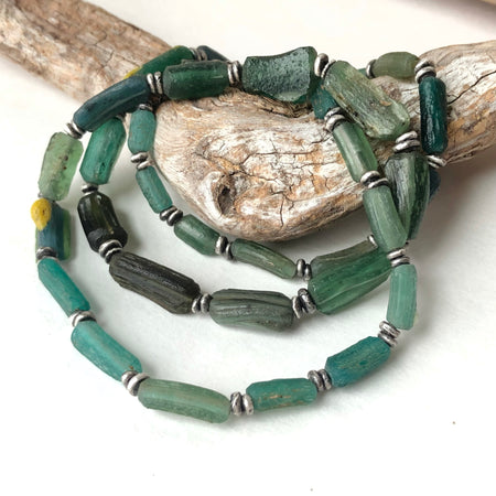Ancient glass shards and components are excavated in Afghanistan, along the Silk Road, a network of trade routes that connected cultures and merchants and spanned from the 2nd century BCE to the 18th century. The glass originated in the regions of the Roman Empire, where glassware became popularized with the invention of glass blowing, around 50 BCE. Glassware was brought into the homes of most Romans and used on a daily basis. It was also traded along the Silk Road. These fragments of glass are repurposed from broken vessels that were buried for hundreds of years along the Silk Trade Road and today are made into beads. Because it is excavated in Afghanistan, I am choosing to call it “ancient glass” instead of “ancient Roman glass.”