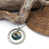 Pendant is 1 ¼” long and hangs from a delicate but sturdy chain measuring 18” and is finished with a lobster claw clasp. All metal is oxidized sterling silver.